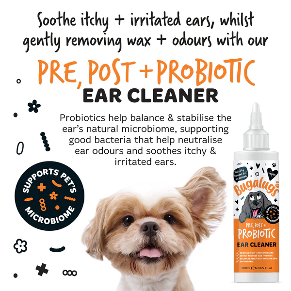 Bugalugs Pre, Post & Probiotic Ear Cleaner is specially formulated to support a healthy ear microbiome and promote ear comfort. Prebiotics, probiotics, and postbiotics work together to help balance beneficial bacteria, neutralise odours, and calm irritation, helping sensitive ears feel comfortable and cared for.