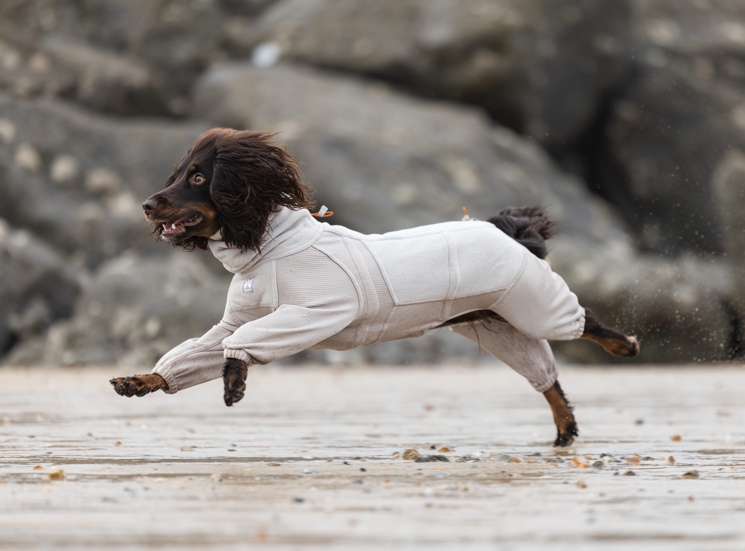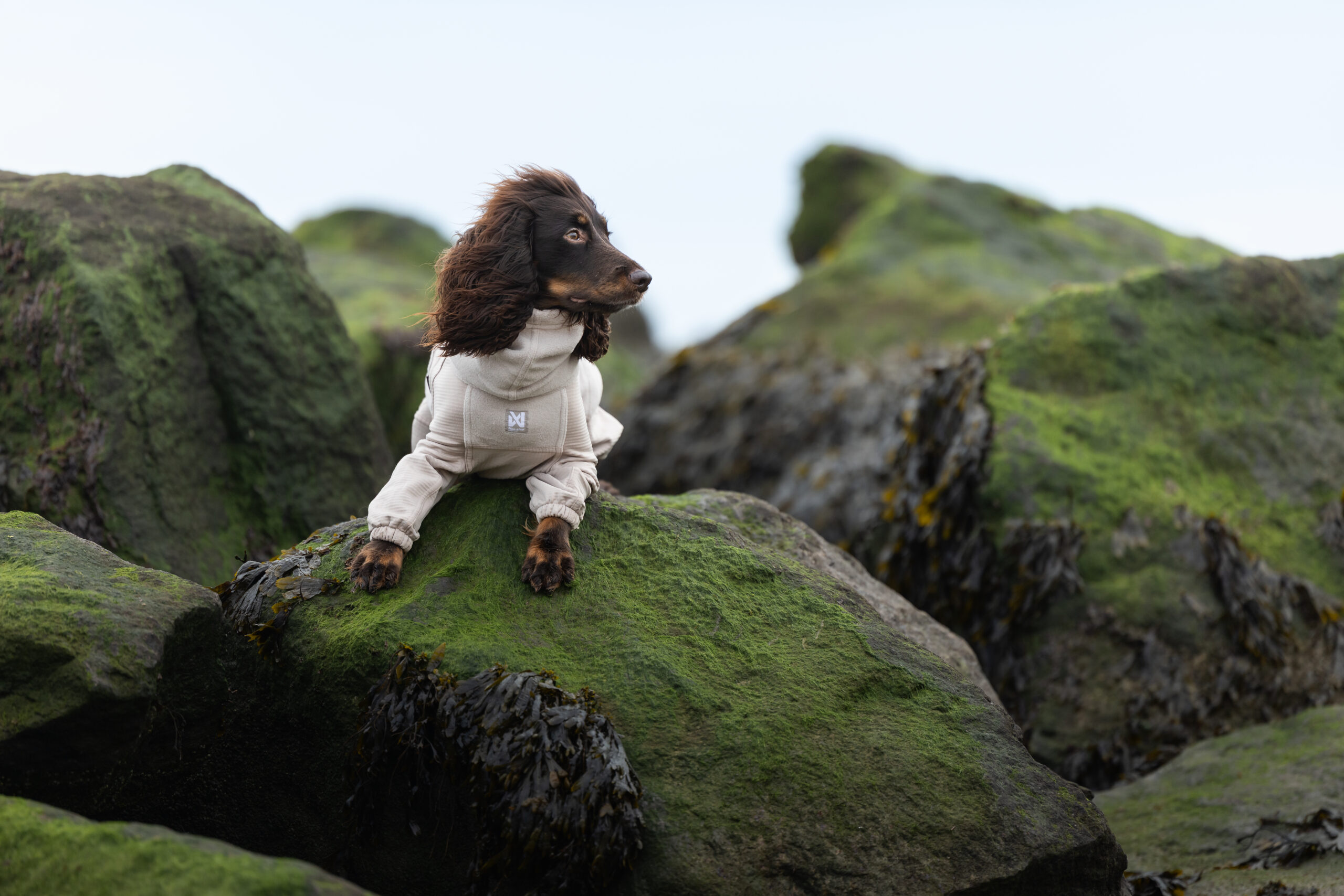 The top and extended neck are made from ultra-soft, high-quality Polartec® fleece for reliable insulation. Multiple panels are combined with a breathable, stretchy grid fleece on the belly and legs, offering the range of motion your dog needs to move freely. This technical, lightweight fabric supports airflow and regulates warmth all the way down to the ankles.
